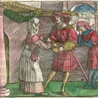 [Act II (First Illustration) – Calisto Paying Celestina While Another Figure (Either Sempronio or Pármeno) Yawns]