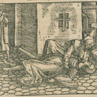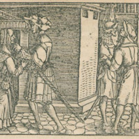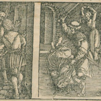 [Act XII (Second Illustration) – The Alguacil’s Men Knock on the Door as Sempronio Murders Celestina]