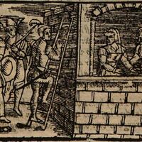 [Act XIX – Calisto, Guarded by Sosia and Tristán, Climbs Melibea’s Garden Wall While Melibea and Lucrecia Watch from a Window (Repeated)]
