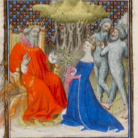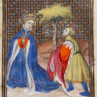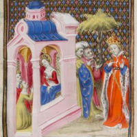 La reine de Saba, accompagnée de deux sauvages, offre au roi Salomon une branche de balsame