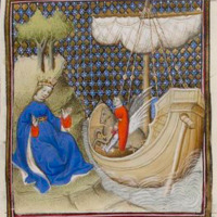Persée monté sur Pégase, son cheval ailé, aborde en bateau au rivage où est assise Méduse