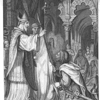 [The Cid kneels before a bishop]