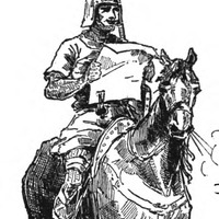 The Cid. Facsimile of cut from reprint in Library of the Hispanic Society of America of old chapbook, Historia del muy esforzado caballero el Cid Ruy Diaz, Campeador. Sevilla: Manuel Nicolàs Vazquez. n. d