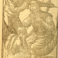 [A European man and a Tupinambá woman weep into their hands while a Tupinambá man stands behind them]
