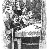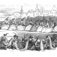 [A group of Lilliputian women sitting in a circle around Gulliver]