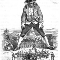 [Lilliputian army marches while Gulliver stands as a triumphal arch]