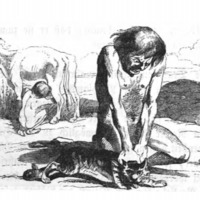 [a yahoo kills its cat while another drinks from the udder of a cow]