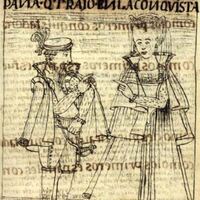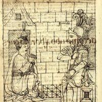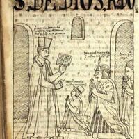 Pide Escrivanias El P[adr]e al Fiscal y Dize el Fiscal, Esta [a]qui Senor, Darete de Escrivuanias y Tinteros una Carga. Dize el Padre, No Busco Eso Hijo que Manana me Yre Luego Daqui