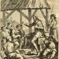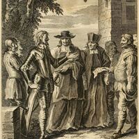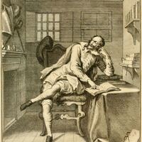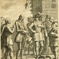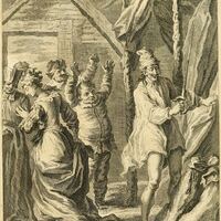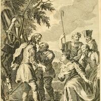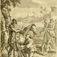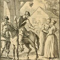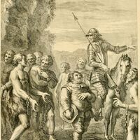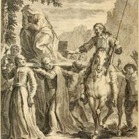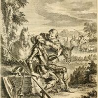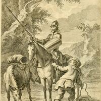 [Don Quixote insists the barber's basin is Mambrino’s helmet]