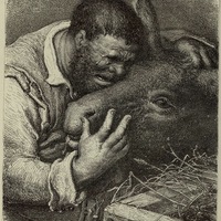 Tirant sa bête par le licou, il s'achemina du coté ou il lui semblait que pouvait se trouver le grand chemin