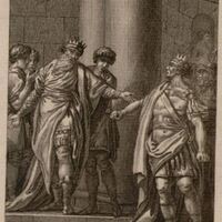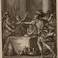Fineo entra en la sala del banquete con el dardo en la mano dirigiendo la palabra a Perseo