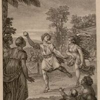 Jugando Jacinto con Apolo, le mata un tejo que el viento desvio