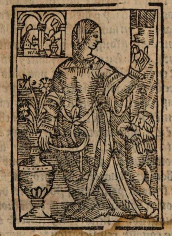 This illustration depicts a female figure wearing a robe and a veil. She is holding the robe’s girdle cord in her right hand and another object in her left hand. To the left, flowers are emerging from a large vase. A small nude figure with wings is seen in the bottom right corner; we can infer that this is meant to represent Cupid. Based on the girdle cord (which is central to Melibea’s storyline) and Cupid’s presence, we can also infer that the figure is meant to represent Melibea. Based on the window in the top left corner of the illustration, through which hills and buildings are seen, it is likely that this scene is occurring indoors. This is odd, since Melibea first encounters Calisto outdoors, in her garden.