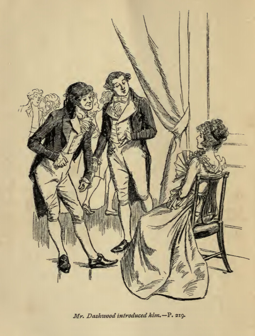 In this image Elinor meets Robert Ferrars. John and Fanny Dashwood, Elinor’s half-brother and sister-in-law had come to London and invited Elinor and Marianne to a dinner party. There Elinor met Edward Ferrars’ mother and brother. Elinor was not impressed with Robert Ferrars, finding him to be nothing like Edward. He was stuck-up and self important. This scene occurs in chapter 36 on page 219 as noted underneath the image. The characters are shown in the traditional regency style, as Elinor wears the regency style dress with an empire waist. Her hair is worn tied up, as was tradition for women after their “coming out” before the queen, signaling her entrance into society. In her hand she hold a fan, used at this period to signal different messages across the room. John Dashwood and Robert Ferrars wear waistcoats and tailcoats with breeches and cravats. The regency period dated to the early nineteenth century (1811-1820) when George, Prince of Wales, later George IV (r. 1820-1830), reigned as regent for his mentally ill father, King George III (r. 1760-1820). The regency period is associated with the rise of neoclassicism in art and fashion.