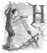 Here a crew member on Gulliver’s ship sees Brobdingnag for the first time. He stands in the crow’s nest on the ship and points to land. This image appears at the beginning of chapter one, and the letter “H” is in the top left corner as the first word of the chapter is “Having”.