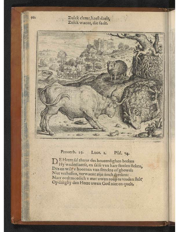 A large bull with its head down stands over a goat sprawled on the ground. Another goat watches the scene from a distance beside tree on the right side of the image. In the background a castle sits on a hill and trees scatter the scenery.