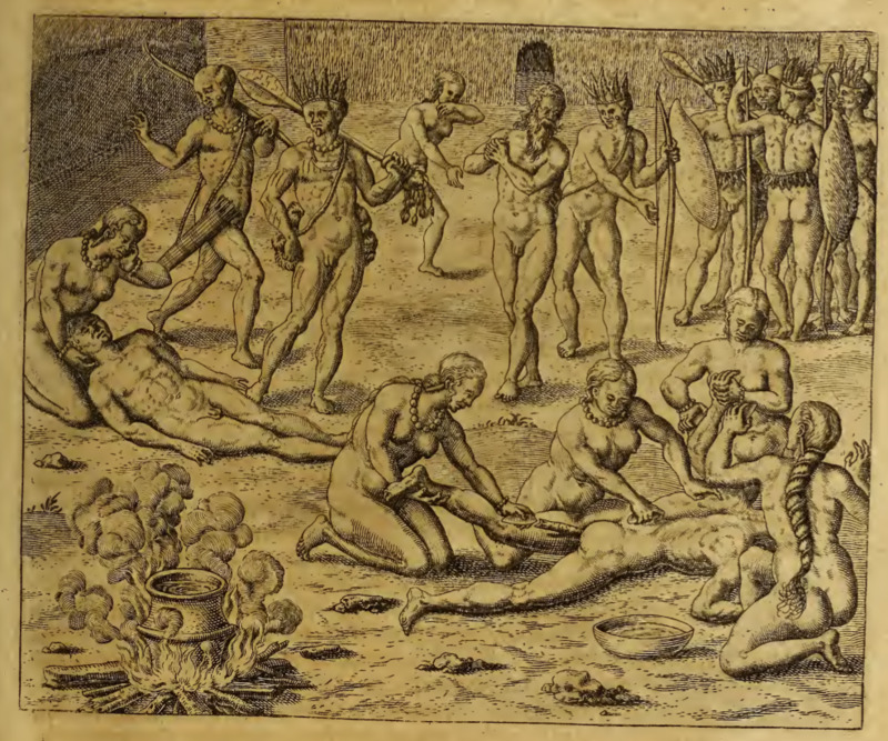 After the execution of a captive, the Tupinambá prepare to dismember the body. On the left a man lays on the ground with a woman, who appears distressed, supporting his head. A man stands beside them holding the ceremonial club used in the execution of the man. To the right the body has been laid out on face down and a group of women clusters around to begin the dismemberment. A pot has been set on a fire near the women. A bearded European man stands in the center watching the group.
