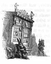 Here we see a personal library on Lilliput. Gulliver tells us that the only person on Lilliput with an extensive library is the emperor, and even the very wealthy have only a small library, with most people not having any sort of library. Gulliver compares the small libraries of individual Lilliputians to a library that could be carried on a donkey’s back; thus, we see a donkey sitting by the base of the bookshelf. This image comes in the appendix to Gulliver’s travels to Lilliput, in which Gulliver critiques the Lilliputian education system. The same image appears in the 1839 Krabbe edition.
