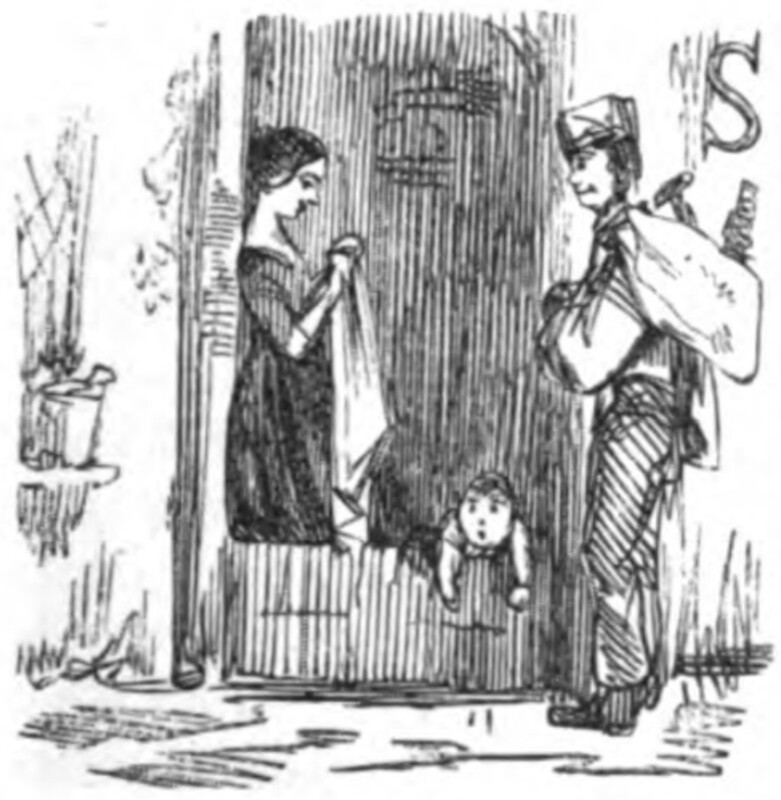 A man carrying a sack over his shoulder stands by a doorway with a low gate. Opposite him is a woman leaning against the door frame, mending a piece of clothing, while a small boy hangs over the gate. On the wall next to the man’s head is the letter S from “Sir”.