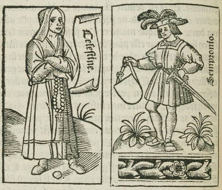The left panel depicts Celestina standing outside. She is wearing a robe and a veil, with what looks like a rosary hanging from her waist. On the right we see Sempronio, who is holding some sort of satchel and has a sword mounted on his belt. Beneath his feet there is a decorative panel, which appears to depict a flower and roots. The entire image is nearly identical to the one found on page 51 (only the decorative panel differs). The left panel is identical to the panel found on the title page (with the exception of the colour found there), the one found at the end of the book, and those found on pages 105, 150, 162, and 221. The right panel is nearly identical to those found on pages 125 (labeled ‘Pármeno’ and no decorative panel), 229 (labeled ‘Centurion’ and no decorative panel), and 235 (labeled ‘Tristan’ and different decorative panel).