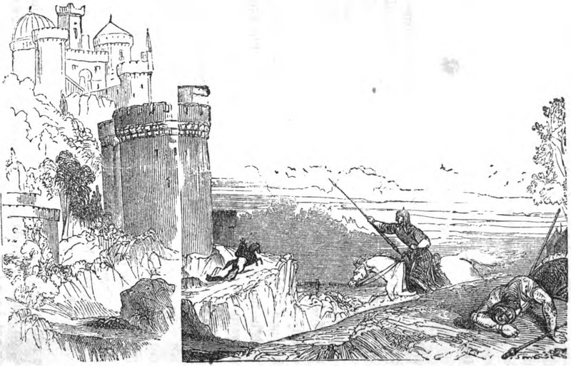 King Don Sancho lies dying on the right, as Rodrigo pursues his killer Bellido Dolfos to the walls of Zamora. Dolfos was a citizen of Zamora, which was ruled by Sancho’s sister Urraca and was the last of the territories inherited by Sancho’s siblings that he had not yet conquered for himself. Dolfos tricked Sancho, saying that he would show him a way into the city. Despite being warned that this was a trap by Arias Gonzalez, a leading noble of Zamora, Sancho went along with Dolfos to his death.