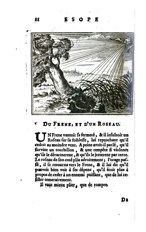 A Frene boasted of his firmness, and insulted a Reed on his weakness, reproaching him for yielding to the least wind. No sooner had he spoken, than there came a whirlwind, and a storm so violent that they destroyed him, and threw him to the ground. The reed on his side bent deftly; the storm passed, he turned back to the Frene, and told him that he could see at his own expense that it was more appropriate to yield to a powerful enemy than to resist him in a temporary manner.