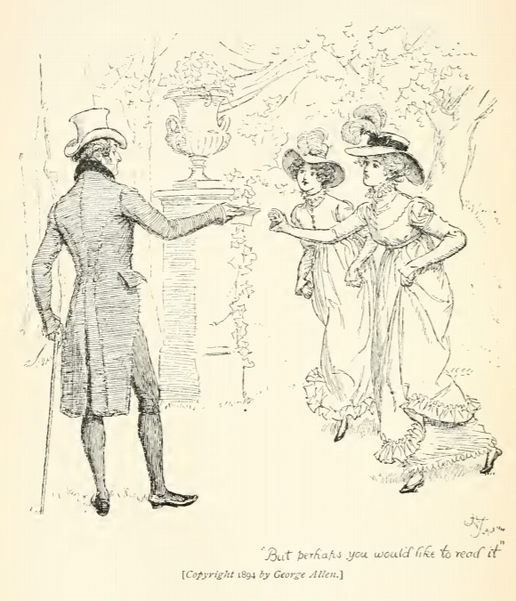In this image Mr. Bennet hands Elizabeth and Jane the letter from Mr. Gardiner. Mr. Gardiner had gone to London to look for Lydia and Mr. Wickham. He writes that Lydia and Mr. Wickham had been found. They were not yet married, and Mr. Wickham required a small annuity and then he will marry Lydia to avoid scandal. This scene occurs in chapter 49. The characters are shown in the traditional regency style. Jane, and Elizabeth wear regency dresses with empire waistlines and bonnets. Mr. Bennet wears a tailcoat and top hat and hold a walking stick. The regency period dated to the early nineteenth century (1811-1820) when George, Prince of Wales, later George IV (r. 1820-1830), reigned as regent for his mentally ill father, King George III (r. 1760-1820). The regency period is associated with the rise of neoclassicism in art and fashion.