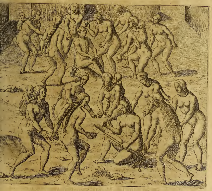 A group of Tupinambá women prepare for the ceremonial execution of a captive man. In the foreground, a woman kneels on the ground and paints or carves the end of a club while other women dance around her. In the background, another group of women dances around the captive man. He sits on the ground on a raised mound while a woman paints his head. He is restrained by a rope around his neck. Several of the women carry small children in baskets or slings tied to their backs.