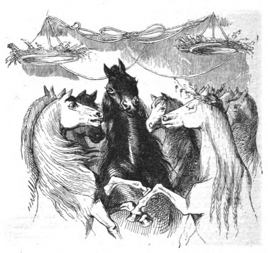 Here we see a group of Houyhnhnms. This image appears when Gulliver tells the readers about the philosophy of the Houyhnhnms. Gulliver tells us that the two principal values of the Houyhnhnms are friendship and benevolence, represented here as we see a group of Houyhnhnms that are friends and appear happy together. The same image appears in both the 1839 and 1843 Krabbe editions.