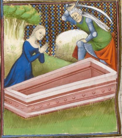 This illumination depicts Polyxena, the daughter of king Priam of Troy, about to be executed in front of Achilles’ tomb. Polyxena is illustrated kneeling with her hands together in prayer while looking down to the ground as she accepts her fate. The man executing Polyxena is Neoptolemus, the son of Achilles. Polyxena had lured Achilles into the temple of Apollo, where Paris shot and killed Achilles with his arrow. Neoptolemus is the person executing her as she is the one who is partly responsible for killing his father. Boccaccio explains that he wrote on Polyxena due to her fearlessness before her execution.