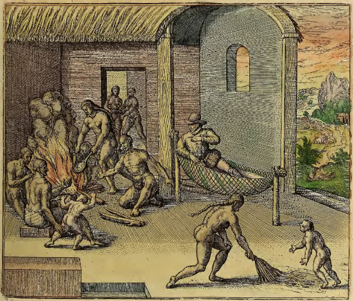 A Spanish man (Girolamo Benzoni) lounges in a hammock inside an Indigenous structure, in conversation with a Nicaraguan Indigenous leader (a Cacique). In the foreground an Indigenous woman sweeps the floor while a child frolics around her. Beside Benzoni’s hammock, a group of Indigenous men and women tend a fire and prepare food. The Cacique sits on a block close to the fire and holds onto the leg of a child while he converses with Benzoni. In the background, two women enter the room with a platter of food. This image is identical to one found on page 157 of Frankfurt, 1595, but colored.
