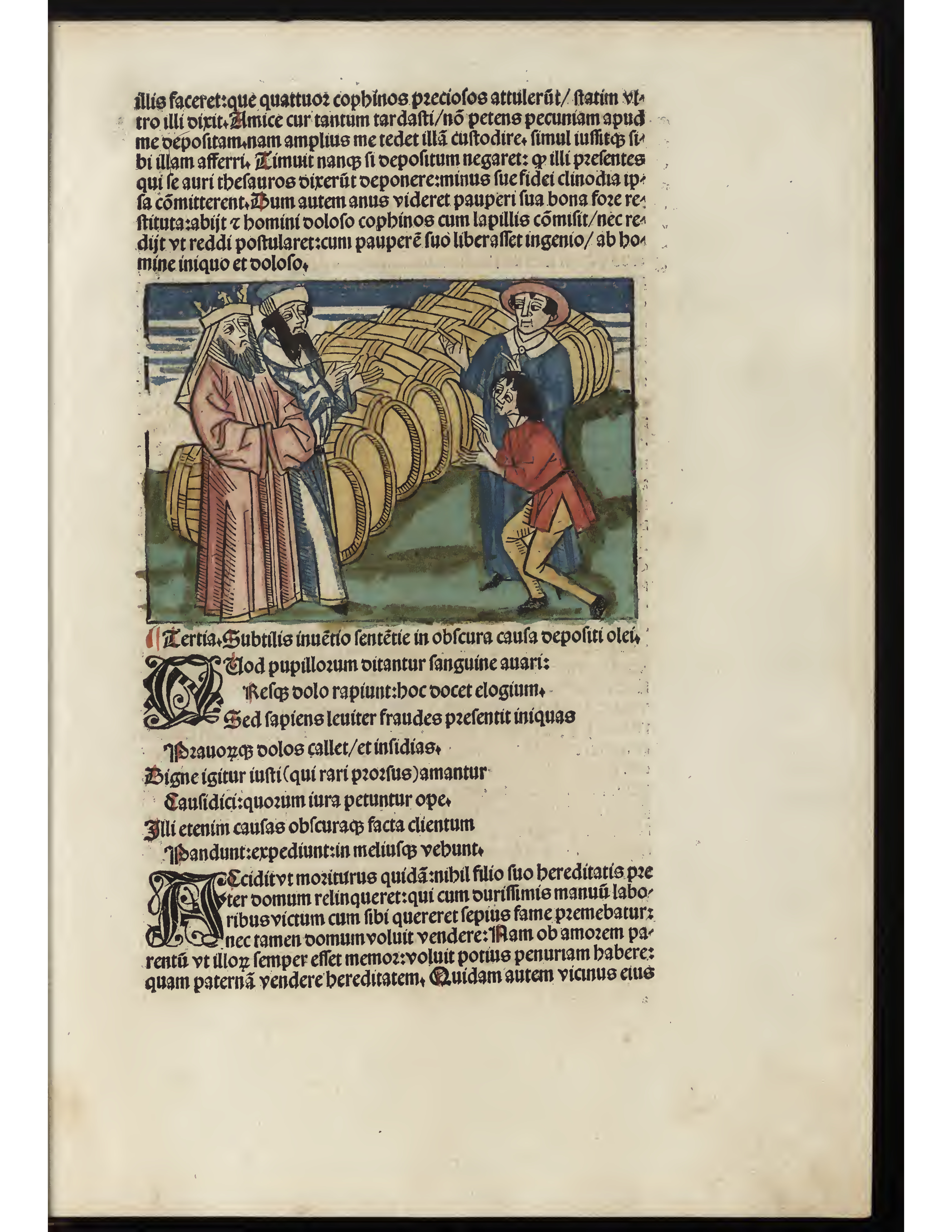 - A man in red robes begs to the king. there are two other men present who are wearing robes and there are barrels in the background.