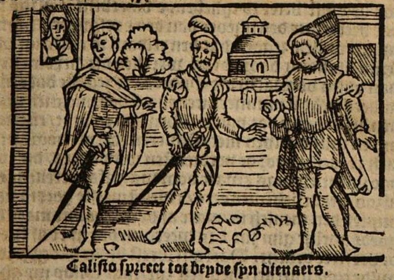 Soon after Celestina visits Calisto’s house, Calisto becomes impatient and orders Sempronio to pay her a visit and hasten her along in accomplishing her task. He does not want to leave Calisto alone, so Calisto asks Pármeno to keep him company during Sempronio's absence, alleviating some of Sempronio’s concerns. Pármeno once again tries to dissuade Calisto from trusting Celestina, but he is again unsuccessful. In the top left corner of the illustration, there is a veiled woman in a window observing the other figures. We can infer that this is meant to represent Celestina, since she is the only female character that appears in the second act. Because the rightmost figure appears to be quite sad, it is likely meant to represent Calisto. Because Sempronio is consistently depicted as a bearded figure in this edition, we can infer that he is likely represented by the central figure. The leftmost figure would therefore represent Pármeno. This figure is shown looking at Celestina while also reaching out toward Calisto and Sempronio, perhaps intended to represent his desire that Calisto should avoid Celestina. All three figures are shown wearing hats and have swords mounted on their belts.