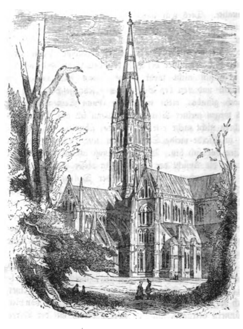 Here we see the great temple of Brobdingnag. The temple is built in the gothic architectural style of many European cathedrals. There is a large tower and two naves. In the foreground we see two giant couples walking among trees. The giants appear very small next to the church, showing the size and scale of the building. There are several large trees in the foreground. The same image appears in the 1843 Krabbe edition.