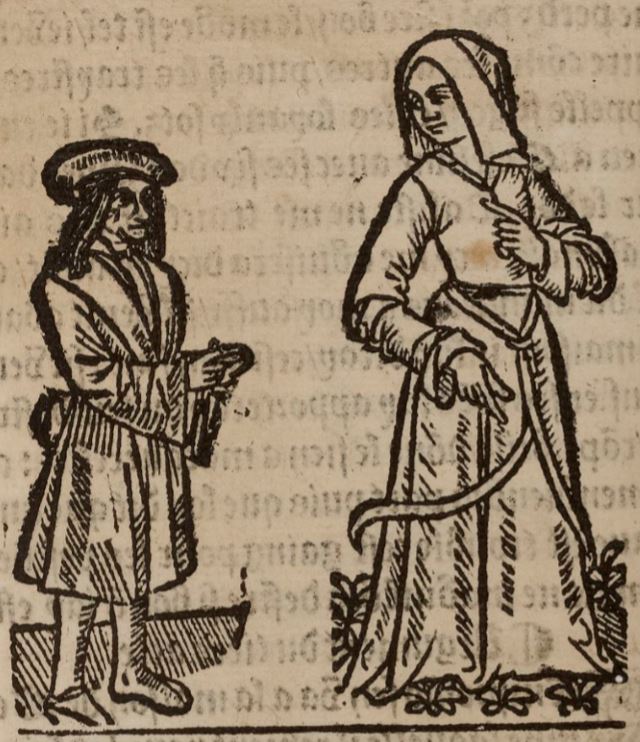 While there is no written indication of who the figures represent, the act in which it is printed only includes the characters Sempronio, Elicia, and Celestina. Celestina is depicted elsewhere as far more aged, and thus we can infer that this illustration depicts Sempronio in conversation with Elicia. Sempronio is depicted as quite small in stature, likely implying his younger age. This could also be intended to represent his lower social standing as a servant to Calisto. He is wearing a hat and a cloak of some sort, whereas Elicia is wearing a robe and a veil.The right side of the image, including the figure and the vegetation near the bottom, is reproduced on the left side of the image found on page 221 of the text (although the figure is used to depict Lucrecia in that instance). The left side, including the figure and the hatched surface at the bottom, is reproduced on the left side of the image found on page 155 of the text (although the figure is used to depict Pármeno in that instance).