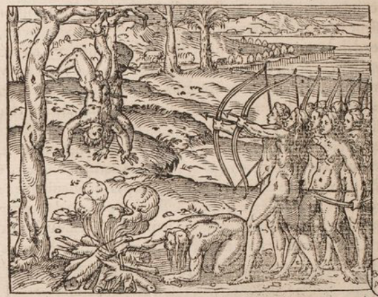 Two men have been captured by the Indigenous Brazilian warrior women, a group which the author calls ‘Amazons’. The men have been hung upside down by one ankle from a tree, and a fire has been lit beneath them. The women shoot arrows at the hanging men. This image is identical to one found on page 960 verso of Paris, 1575 (l’Huillier), and in Thevet’s Les Singularitez de la France Antarctique (page 126 verso of Paris, 1557 and page 126 verso of Paris, 1558).