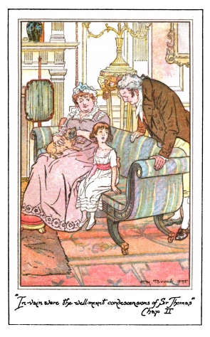 Here we see Fanny as a young girl sitting on the sofa next to her Aunt Bertram. Her uncle, Sir Thomas, leans over the sofa, speaking to her. On Lady Bertram’s lap is her pug. This scene occurs when Fanny arrived at Mansfield Park. The Bertrams brought Fanny to live with them when she was ten years old to help relieve some of the pressure on her mother, who had several children and very little money. Next to Lady Bertram, we see a fire screen, a piece of furniture used to shield a woman’s face from the heat of the fire to prevent her blushing. This scene occurs in chapter 2 as noted underneath the title of this image. The characters are shown in the traditional regency style. Lady Bertram and Fanny wear the regency style dress with an empire waist. Lady Bertram’s hair is worn tied up under a mop cap. Fanny’s hair is short, tied out of her face with a ribbon. Sir Thomas wears a waistcoat and tailcoat, and knickers that stop at the knee. The regency period dated to the early nineteenth century (1811-1820) when George, Prince of Wales, later George IV (r. 1820-1830), reigned as regent for his mentally ill father, King George III (r. 1760-1820). The regency period is associated with the rise of neoclassicism in art and fashion.