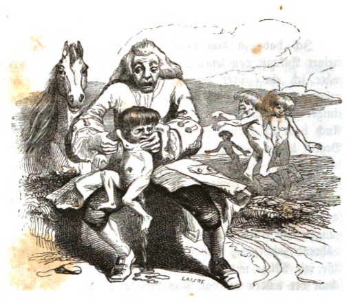 Here we see Gulliver attempting to hold a yahoo child who appeared to need help. However, the child squirmed and got free. The child was three years old and was playing with other children and fell. In this image we see Gulliver holding the child, with others chasing each other in the background on the right, and a Houyhnhnm on the left. The same image appears in the 1843 Krabbe edition.