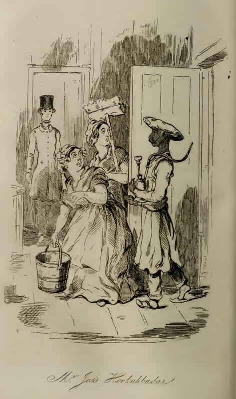 Loll Jewab, Joseph Sedley’s servant from India, carries his hookah into the house, shocking the employees. The two women, one holding a bucket and the other a broom, were cleaning the floor, while the man stands next to an inside door. Below the illustration is printed in cursive its title, “Mr. Jos’s Hookahbadar”.