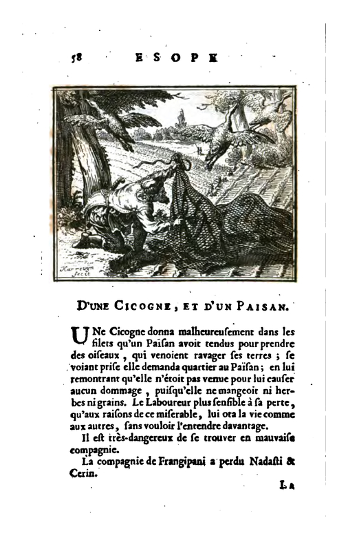 A stork unhappily fell into the nets that a Paisan had set to catch some birds that had come to ravage his land; seeing herself caught, she asked the Paisan for mercy, pointing out to him that she had not come to cause him any damage, since she was more sensitive to her loss than to the reasons of this miserable man, and she gave him her life as she had the others, without wanting to hear him more.