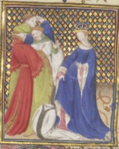 Constance, the empress of Rome and queen of Sicily, had spent her life in a convent until she was forced to marry Emperor Henry VI. She miraculously became pregnant with Emperor Henry’s child at the age of fifty-five. To avoid suspicion from his citizens, Henry ordered that all the women of Sicily be present for the birth of their child to validate Constance’s pregnancy and birth. This image depicts Constance on the right side of the image wearing a blue dress as her pregnancy shows through the dress. There are people on the left side of the image who are present to witness the birth.
