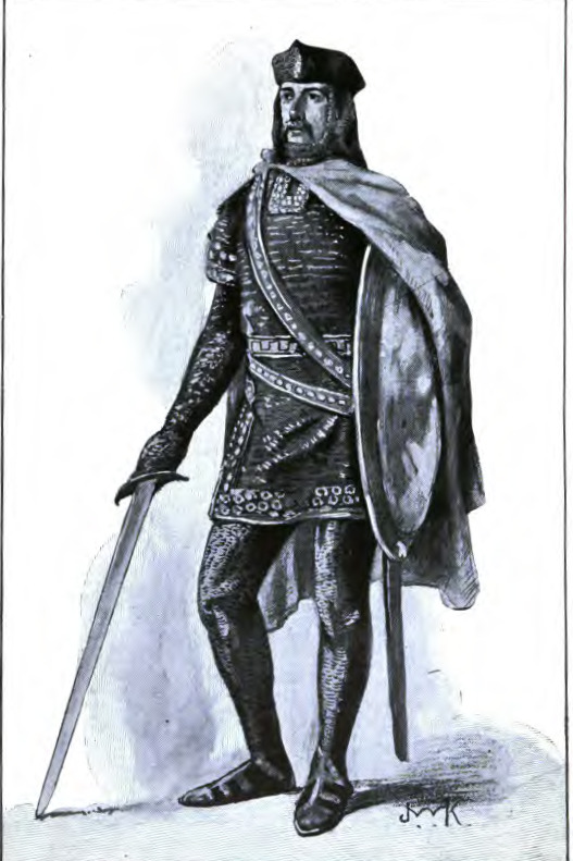 - The Cid stands in armor, holding his shield in his left hand and his sword in his right. He wears a hat and an elaborate suit of armour.