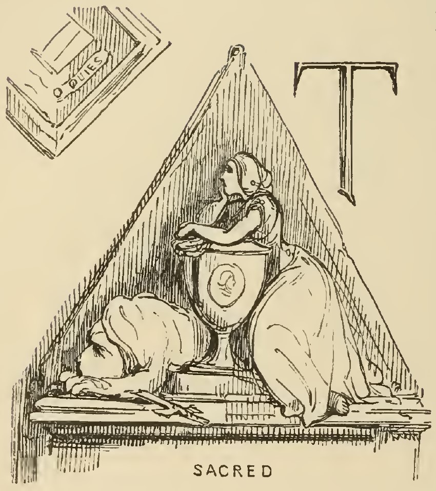Inside of a triangle, a woman leans over a large trophy with one hand on her chin. At the base of the trophy are a cross and a shape that may be a sphinx or a large dog. Beneath the triangle, the word “SACRED” is printed. Above the left side is a cut-off rectangle imprinted with “O QUIES” and above the right side is the letter T from “The”.