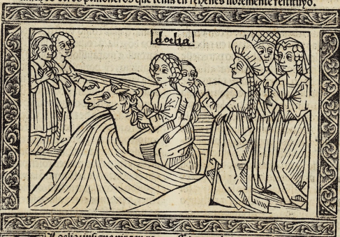This engraving depicts Cloelia, a young Roman woman, riding a horse through a deep river with many women looking at her. Boccaccio explains that Cloelia was given to a foreign king as a hostage, and when she escaped, she took many other hostages with her to get back to Rome. While escaping, she came across a river that was too treacherous to pass. She found a horse, and despite never having ridden one, she got herself and the other women across safely by means of this horse. This image depicts her taking the other women across the river one by one as there is only one other female on the horse with Cloelia. We know that this figure on the horse is Cloelia as her name is engraved above her head.