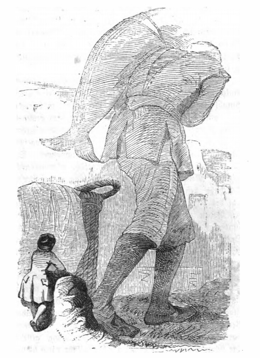 In this image we see Gulliver watching a giant from Brobdingnag carrying a large fish over his shoulder. The image comes when Gulliver describes the countryside in Brobdingnag. Gulliver leans on a rock, relaxing. The giant is hunched over with a large fish thrown over its shoulder. We see the backs of Gulliver and the giant. Next to Gulliver is a large basket. The same image appears in the 1843 Krabbe edition.