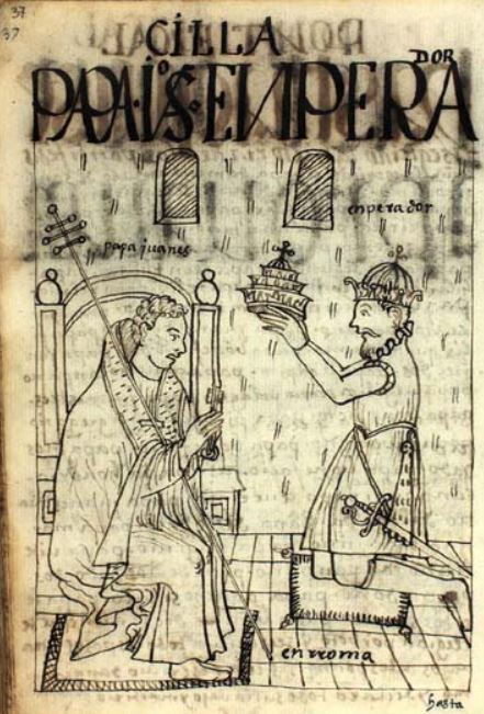 This illustration depicts Emperor Constantine IV crowning John V as Pope. John V is pictured kneeling on the left side of the image with his hands together. He is holding a staff with three horizontal bars at the top of it, which symbolizes pontifical power. The words “papa juanes” are written above his head, which translates to “Pope John.” Emperor Constantine IV is depicted on the right side of the image kneeling as he prepares to place the papal crown on John’s head. The word “enperador” is written above his head, which means emperor. The words “en roma” are written below Constantine, which identifies the city in which the crowning is taking place.