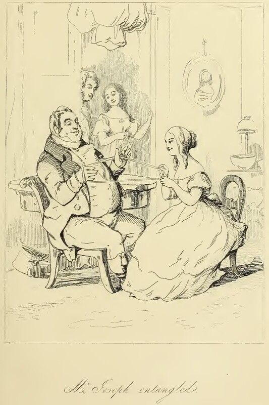 Joseph Sedley and Rebecca Sharp sit at two chairs in front of a round table; she holds both ends of a string of silk which is wound around his hands. Beneath the table is Joseph’s hat, and in the background, another table with a lamp and bowl and a portrait upon the wall. Amelia Sedley and George Osborne are entering through the doorway behind the round table at which the others sit. All four look pleased. Below the illustration is printed in cursive its title, “Mr. Joseph entangled”.