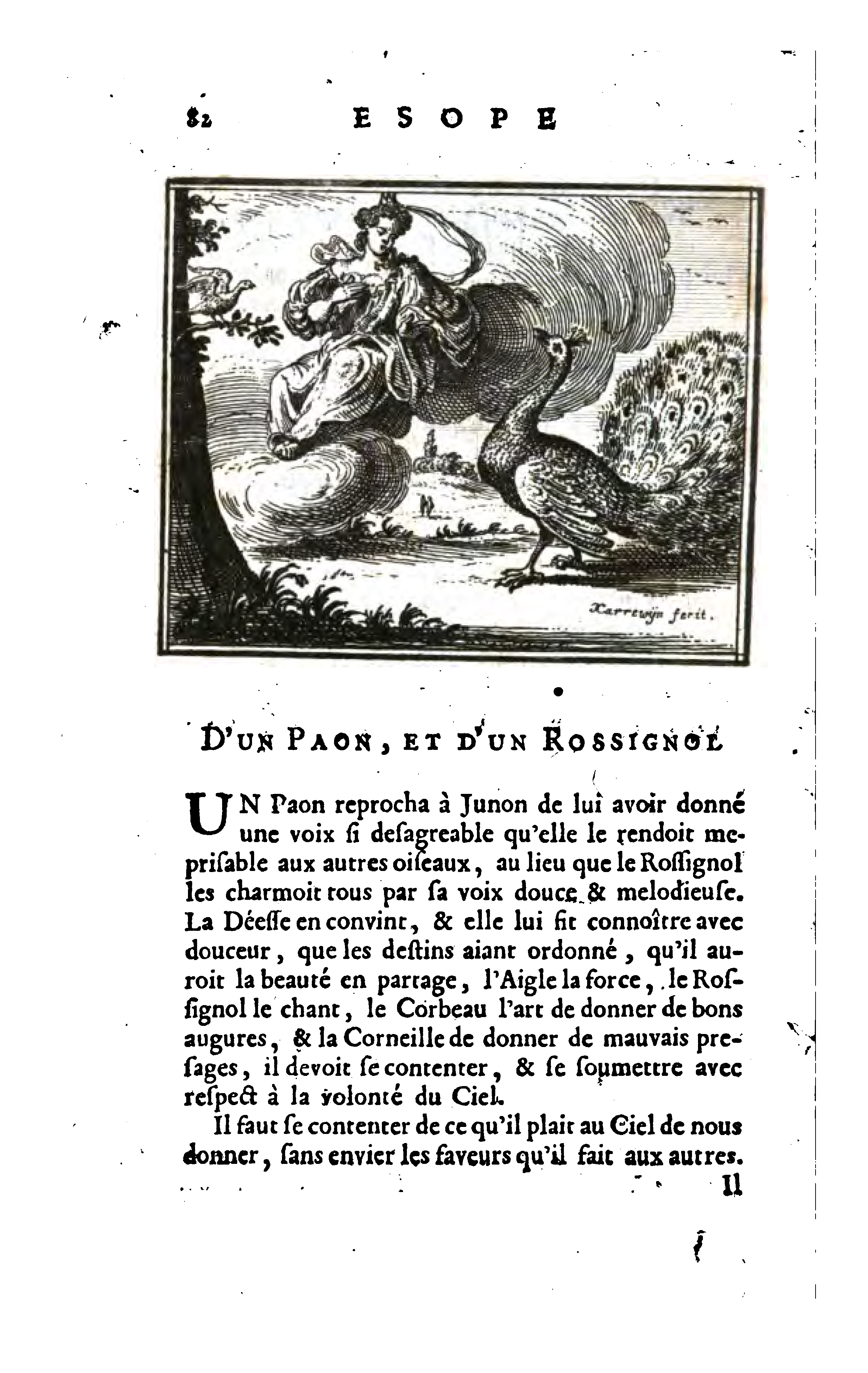 The image depicts a peacock who complains of his voice to the goddess Juno. The peacock envy’s the voice of the nightingale and is told by Juno to appreciate the beauty he has and not to compare himself to others. Juno sits in the middle of the image on clouds with the peacock standing to her right and a nightingale perched on a branch to her left.
