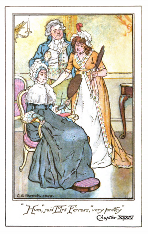 Here we see Mrs. Ferrars sitting in a parlor with her daughter, Fanny, standing next to her, and John Dashwood, her son-in-law. This scene occurs while Fanny and John Dashwood host a dinner party in London, inviting Elinor, Marianne, Mrs. Jennings, Colonel Brandon, Lucy and Anne Steele. The quote that is the title of the image is when Fanny introduced Elinor and Marianne to her mother, who was very dismissive of them. Fanny and Mrs. Ferrars hold fire screens in their hands fire screens painted by Elinor and given to her half-brother and his wife. Fire screens were used to block a woman’s face from the heat of the fire. The fashion of the time was for women to have pale skin, and the fire screen would keep a woman’s face from flushing from the heat. Colonel Brandon was admiring the screens, and Fanny informed her mother that they were done by Elinor. Mrs. Ferrars’ response was “Hum, very pretty” without really looking at them. Fanny blushed thinking her mother’s response was quite rude, praised their beauty, but not wanting to praise Elinor too highly, compared them with the paintings of Miss Morton, a rich woman whom Edward Ferrars was supposed to marry. This scene appears in chapter 34 as indicated underneath the image. The characters are shown in the traditional regency style, as Elinor and Lucy wear the regency style dress with an empire waist. Their hair is worn tied up, as was tradition for women after their “coming out” before the queen, signaling her entrance into society. They wear bonnets to protect their faces from the sun. Going for walks was a popular pastime among young upper-class women at this time, and bonnets were worn to protect the face from getting tanned, because having light skin was more fashionable. They also carry muffs used to warm the hands. The regency period dated to the early nineteenth century (1811-1820) when George, Prince of Wales, later George IV (r. 1820-1830), reigned as regent for his mentally ill father, King George III (r. 1760-1820). The regency period is associated with the rise of neoclassicism in art and fashion.
