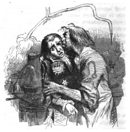 Here we see a scientist from the Grand Academy of Lagado on Balnibarbi who greeted Gulliver by embracing him. Gulliver is now dressed in the style of the locals, wearing a jacket with a motif of astronomical and mathematical symbols on it. Gulliver was unhappy to be greeted in this manner as the room had a terrible stench. This smell was caused by the scientist’s experiments. He was attempting to restore excrement to the food that was consumed. The same image appears in the 1843 Krabbe edition.
